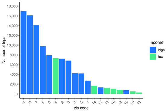 Figure 4a shows the map of the stations, the existing network of bicycle paths, and the relevance of the stations according to the number of trips at the origin station during the period of analysis. This map also presents the road/street network, which is sometimes used in combination with the bike paths to complete some trips. Additionally, zip codes with a per capita income lower than the mean are distinguished from the rest. The map shows that there is a clear geographical bias in the distribution of income. The cutoff point to distinguish higher- and lower-income zones is the mean income in the city. Of the nineteen zones in the city, ten out of twelve have stations in higher-income zones, and three out of seven have stations in lower-income zones. The map shows that most of the stations are located in higher-income zones, which correspond to the city center. Neighborhoods located far from the city center lack stations and bike paths currently. This fact is partly due to the orography of the city, which hinders the use of bikes in higher-altitude areas.