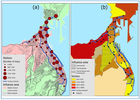 Bicycle paths, stations with (a) relevance according to the number of rental trips at the origin stations and income level; and (b) workers in the bike network influence area and economic activity.