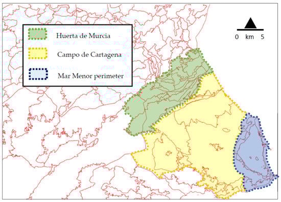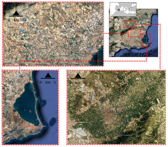 To carry out the research, a comparative analysis of three study areas that are geographically close together, but which present very different boundary conditions in their territorial configurations, is proposed. Three samples of relatively similar sizes located in the region of Murcia (southeastern Spanish Mediterranean region) were chosen. The samples for the analysis were the metropolitan area of the city of Murcia, called the Huerta de Murcia, the coastal perimeter of the Mar Menor lagoon and the agricultural area called the Campo de Cartagena (Figure 1).