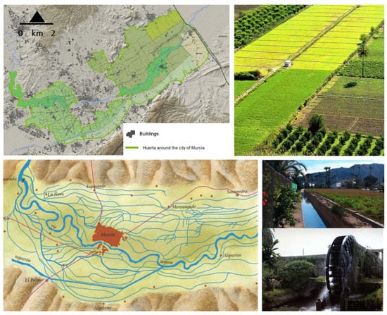 The Huerta de Murcia landscape: size of the area linked to the city of Murcia (upper left), example of its landscape values (upper right), schematic map of the ditch network that covers the entire territory of the orchard (bottom right) and traditional hydraulic infrastructure of the area (bottom left).