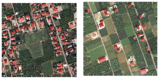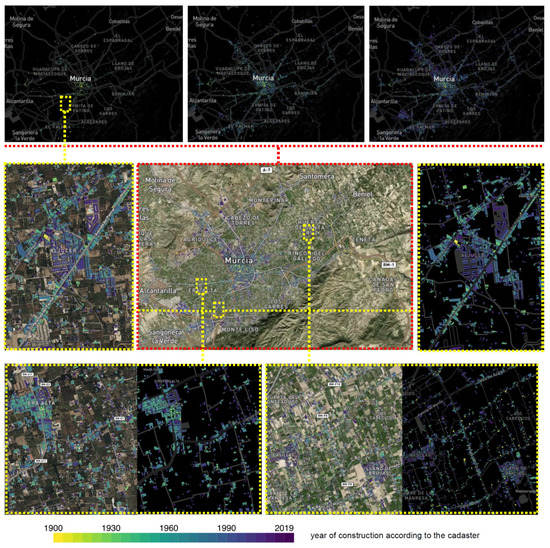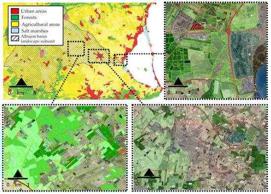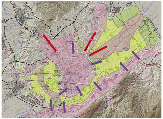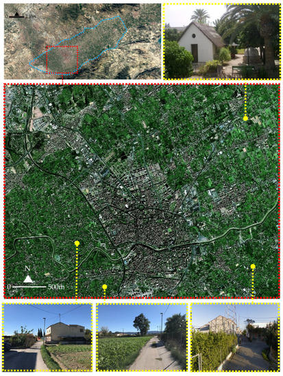 This area has seen its landscape configuration strongly altered in recent decades because of various anthropic processes associated with the strong urban growth that the entire area of the city of Murcia (the seventh most populous urban area in Spain) has experienced. The progressive urbanization of many periurban areas of this environment through the construction of small roads or urban paths to improve connectivity, changes in land use and the illegal construction of numerous houses scattered throughout the entire territory of the orchard (more than 10,000 houses in recent decades, theoretically for purposes linked to agricultural activities and finally destined for residential use) have transformed traditional agricultural areas into mixed environments more typical of a “garden city”-type landscape, in many places with a rather chaotic configuration (Figure 3).