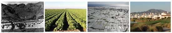 Original and current landscapes in the Campo de Cartagena area (from left to right: original cultivation of dryland fruit trees, intensively irrigated fruit and vegetable crops, a sea of plastic made up of greenhouses and golf resort-type residential developments).