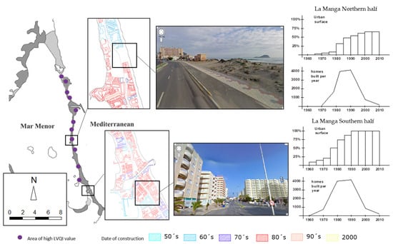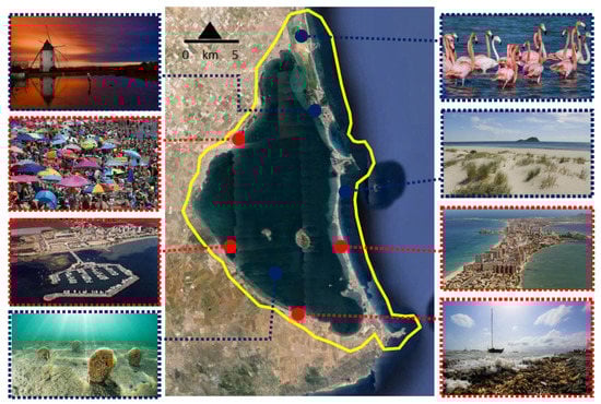 In the eastern part of the lagoon, the old dune cord that separates the two seas has been massively urbanized in recent decades and is currently a hypertrophied urban area with buildings for sun and beach tourism. Even so, we can still find small spaces in which the original dune ecosystems of the beach persist. On the interior coast of the lagoon, various heavily urbanized areas and several marinas, whose impact on sedimentary dynamics causes alterations in the beaches, intermingle with spaces of high ecological value, such as undeveloped salt marshes and crypto-wetlands along the coastal perimeter (Figure 6).