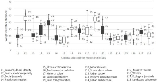 - Scoring and selection of indicators: The interviewees had to give a score from 0 to 60 to each of the selected concepts. To avoid statistical biases due to exaggerated subjective evaluations, only those concepts whose box of a box and whisker diagrams posed a differentiated higher evaluation with respect to the median of the set of concepts evaluated, were selected. Applying this criterion, four indicators of landscape value and three indicators of territorial anthropization were selected.