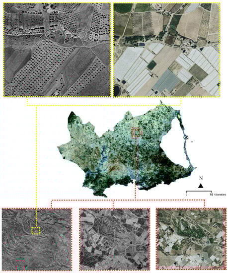 The second study area corresponds to a group of municipalities that constitute what is called the Campo de Cartagena subregion. These are small populations which had traditional rainfed agriculture with a population of barely 30,000 inhabitants in more than 20,000 hectares. After the construction of the large hydraulic infrastructure for the transfer between the Tagus and Segura rivers in the 1970s, this area progressively transformed its traditional dryland activity with trees and woody crops to intensive irrigated agriculture. In this way, the traditional landscapes of fruit trees were replaced by vegetable fields and greenhouses. At a business level, these now constitute the current real “Orchard of Europe” and are known from a visual point of view in several areas as the “sea of plastic” (Figure 4).