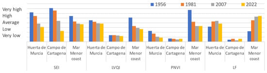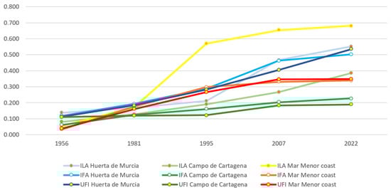 For this, a spatiotemporal evaluation of land use changes according to the European Corine Land Cover and the Inspire Directive criteria [] will be carried out for each landscape subunit. For the determination of this parameter, all the surfaces established as being artificial by the Information System on Land Occupation of Corine Land Cover 2018 (category 1 uses and agricultural areas established as greenhouses) have been considered. The higher the index value, the more “artificialized” the landscape of the subunit: