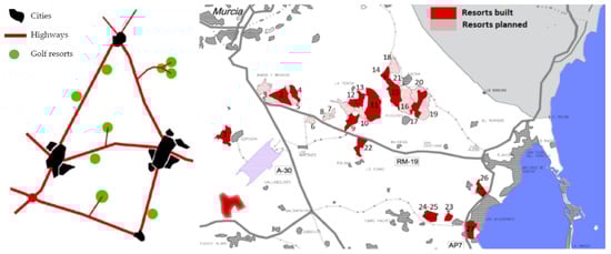 Subsequently, thanks to the growth of tourism in the area and the real estate boom that took place in Spain as a whole from the mid-1990s, several of such agricultural areas were also transformed into golf resort-type residential developments primarily for foreign tourists. The development of these residential projects has contributed to the construction of numerous roads in the area that break up the territory, configuring a heterogeneous landscape that combines agricultural crops with urbanization, golf courses, low population density and high surface occupancy (Figure 5).