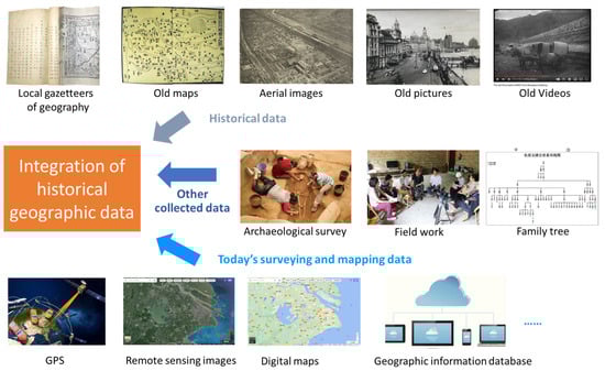Historical geographic data play an important supporting role in the study of long-term geographic studies, such as climate change, urban expansion and land-use and land-cover change. Via these studies, we can learn about the historical geography and even reconstruct the past geography so as to further understand the relationship between man and land from a longer-term perspective. The study of historical geography and spatial information science facilitates innovations in historical geographic data collection, storage, retrieval and representation and overall improvements in effective data use [5,6]. Historical geographic data are widely presented in historical documents such as old maps, produced historical vector data, historical aerial images, old pictures and even old videos, as shown in Figure 1 [7,8,9]. With the continuous discovery of historical data and the improvement of digitizing methodology, the amount of spatial data available is increasing [10,11]. These data often have different sources and creators, diverse structures, scattered distributions, long time series, ambiguity and large differences in spatial resolution.