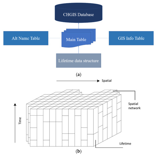 Geographical data are largely concerned with the spatial dimension of the data, whereas time is also an important dimension for historical data. In the CHGIS project, the concept of lifetime was proposed [19]. The lifetime concept refers to a condition under which locality names, identified spatial characteristics and administrative affiliations remain unchanged from the time of its establishment until that of its change. This is the most important data attribute in the CHGIS and can therefore be considered a spatiotemporal data model. The structure of the CHGIS database is shown in Figure 4a, and the lifetime data structure is shown in Figure 4b.