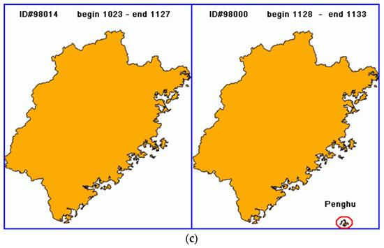 When opening the CHGIS data in the GIS software, there will be four columns (BEG_YR, BEG_RULE, END_YR, END_RULE), which represent the starting and ending year and the corresponding rules of the name of a geographic object (the administrative polygons). Any changes to a geographic object will generate a new code. A code is an ID that uniquely identifies a spatiotemporal specific object or event and has no spatiotemporal meaning. When the spatial extent of the administrative unit changes, the ID also changes correspondingly. For example, when identifying Fujian Province, ID#98014 and ID#98000 actually identify different ranges (seen in Figure 4c). In the year 1128, at the same time the administrative seat was moved, the jurisdictional area increased. The polygons (actually, a group of polygons regionalized as one object in GIS to account for coastal islands) that represent the two periods look almost the same, but there is a difference. In 1128, Fujian Lu expanded to include Penghu Island (circled in red).
