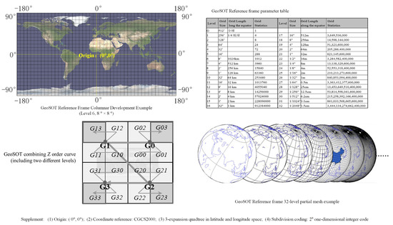 Among the various kinds of spatial information grids, the GeoSOT grid was selected for this study (Figure 5). The geographic coordinate subdivision grid, with one-dimensional integer coding on the 2n-tree (GeoSOT) model, is a subdivision and coding method that subdivides the Earth’s surface into 2-D spatial grids.