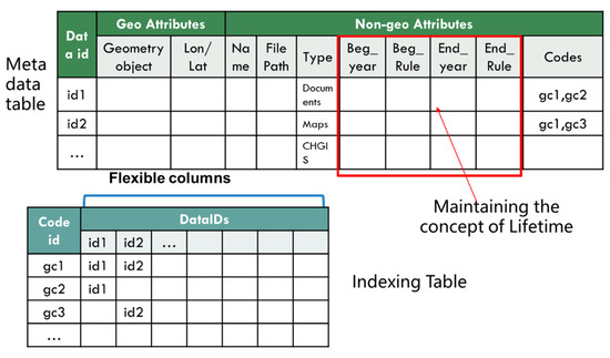 Figure 6 shows the most simplified data storage template, where Codes is the GeoSOT code calculated through spatial position information and is used as the index of spatial query, supporting various operations of coding-binary; Level (the spatial granularity of the data) is reflected by the length of the code and is not specifically stored as a column (since GeoSOT uses quad-tree division, the longer the code, the finer the granularity); Name is the original data name of the data; Type is the original data type, including various types shown in Figure 1, such as documents, maps, vector data, images, video, etc.; and FilePath is the path of the data, which is usually a record in an existing database or a file in the file system (operating system). In particular, we preserve the lifetime data structure in CHGIS and preserve the concept of lifetime and four attribute columns (BEG_YR, BEG_RULE, END_YR, END_RULE). After the metadata are stored, we index the code of the Codes column and then associate the corresponding Data id. This index helps store data uniformly and speeds up its retrieval.