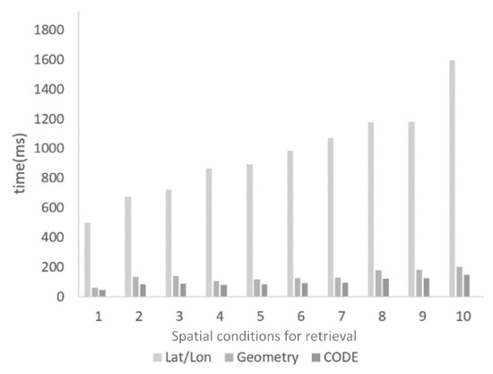 Then, according to the spatial resolution of the simulated data, the 15 layers of the GeoSOT grid were selected for the experimental verification of the query efficiency (since Shanghai, as an urban research area, is usually studied on a kilometer-scale grid, level 15 in the GeoSOT model is chosen, which corresponds to the kilometer-scale grid). We built a B-tree index for the latitude/longitude columns, a B-tree index for the code columns and a 2dsphere for the geometry object columns, respectively. Next, we arbitrarily selected polygonal regions of different regions (disjoint) within Shanghai for the query, returned all attribute columns, recorded the execution time of the returned results and, finally, took the average of multiple results for comparison. The statistical comparison of the query time is shown in Figure 9.