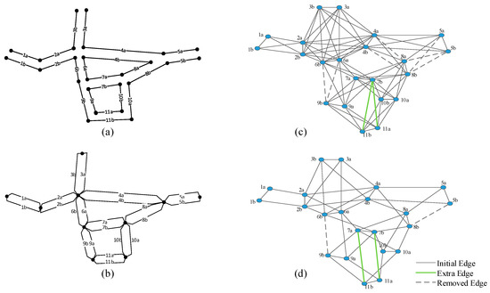 Schematic conversion of the initial road network to an Edge Graph: (a) initial road network; (b) road network; (c) Edge Graph (for pedestrian flow or roadside facilities); (d) Edge Graph (for vehicle flow).