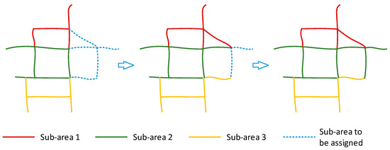 - Check whether there are sub-areas that do not satisfy the length constraint by Equation (11). If so, assign these sub-areas according to the principle that are adjacent and have the most similar weights. If not, skip directly to step 5.