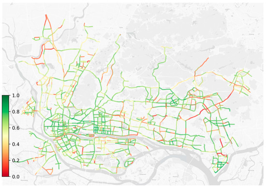 Because of the wide coverage of this survey, there are inevitably some missing data. We used the average of the barrier-free facilities scores of the adjacent road segments of the road segments missing data to fill the data of these segments. In addition, we also processed the initial road network to obtain a road network in the form of Figure 1b. As shown in the visualization of the barrier-free facility level score in Figure 5, the green color indicates a high score, while the red color is the opposite.