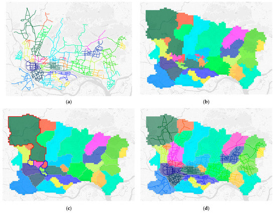 Partitioning results of the case road network: (a) initial line sub-areas; (b) initial surface sub-areas (without adjustment); (c) initial surface sub-areas; (d) final partitioning result.