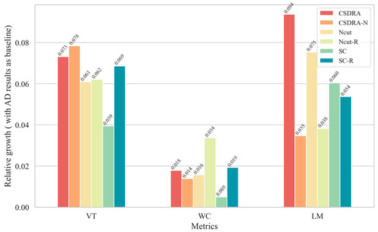 To validate the effectiveness of the method proposed in this paper (CSDRA), we selected well-established partitioning methods for comparison, including Administrative Division (AD), Spectral Clustering Algorithm (SC), and Ncut, which have been widely used. Meanwhile, to assess the performance of the method proposed in this paper (CSDRA) without constraint adjustment and the effectiveness of constraint adjustment, we include CSDRA-N (with maximum constraint intervals) in the comparison. Furthermore, to validate the effectiveness of the road network reconstruction method, we also applied the Edge Graph obtained by this method to SC and Ncut, resulting in SC-R and Ncut-R for comparison. The performance of each method was evaluated using three evaluation indicators, as shown in Figure 7 and Table 2. The data in Figure 7 represents the relative growth value, which is calculated by comparing each indicator with the corresponding indicator value of the AD method used as a benchmark. A larger value indicates a better partitioning result obtained by the method, corresponding to a smaller original indicator value. The evaluation results of the first two indicators, obtained from CSDRA and CSDRA-N, show better performance compared to other methods. This suggests that the partitioning results achieved by CSDRA exhibit improved intra-area homogeneity and inter-area heterogeneity. Furthermore, the evaluation results based on the LM indicators demonstrate that CSDRA performs the best, while CSDRA-N, without effective partition and assignment, shows poorer performance. This indicates that CSDRA effectively reduces the size variability by adjusting the sub-area sizes within constraints without significantly compromising the intra-area homogeneity and inter-area heterogeneity of the partitioning results. Additionally, a comparison of Ncut with Ncut-R and SC with SC-R reveals that incorporating the Edge Graph obtained through road network reconstruction enhances the performance of the partitioning results in terms of both intra-area homogeneity and inter-area heterogeneity. However, it should be noted that this improvement may come at the minor cost of increased size variability.
