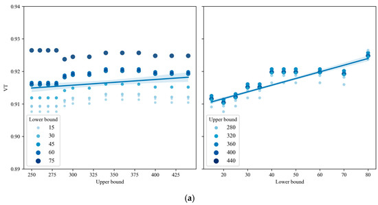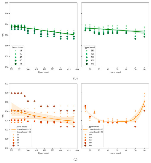 To conduct a thorough analysis of the CSDRA performance and investigate the impact of constraint parameter adjustments on the partitioning results, we conducted multiple experiments with different combinations of upper and lower bound constraints. The results of these experiments are presented in Figure 8. In Figure 8, the vertical axes represent the values of different evaluation indicators, denoted by different colors. Specifically, Figure 8a–c represent VT, WC, and LM indicators, respectively. The horizontal axes represent the upper and lower bound constraints. Each subplot in Figure 8 is a scatter trend plot, where the scatter points are differentiated by color shades and sizes. Each point represents the evaluation result of an indicator under specific constraints. The curve or straight line represents the trend fitting line of all scatter points. To facilitate the following discussion, we must clarify a few concepts. Regarding the upper bound constraint, a larger value indicates a more relaxed constraint, while a smaller value indicates a tighter constraint. The opposite is true for the lower bound constraint. Furthermore, the lower bound constraint should not exceed the upper bound constraint, and the maximum value of the lower bound constraint should not exceed the minimum value of the upper bound constraint.