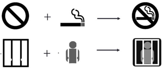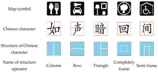 According to Gong et al. [13], map symbols can be represented by the structural operators of Chinese characters as map symbols are also two-dimensional, just as the structures of words are described in natural language. However, not all of the map symbols can be represented by such structural operators, basically because of the topological problem. For example, a compound map symbol may be composed of two symbols with overlaps (e.g., the non-smoking symbol) but the structural operators are not able to represent such a composition.