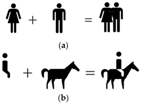 A blend operator is a binary operator designed to fuse two or more components from any direction into a new complex component, as some map symbols have complicated graphics. For example, the compound symbol of the toilet in the following symbol is horizontally formed by fusing the two components of “male” and “female” (see Figure 3a). The compound symbol of “horse riding” is vertically formed by the components of “human” and “horse”.