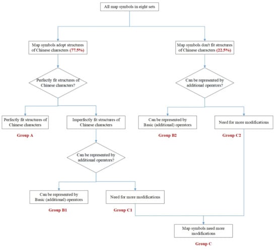 All map symbols in these eight sets were bifurcated into group A, in which each symbol perfectly fits the structural operators of Chinese characters, and group B, in which the map symbols fit structural operators with an imperfection, or the structural operators do not apply. For the symbols in group B, we employed additional basic operators to express them. The symbols in group B were divided into two groups, group B1 is map symbols that can be expressed by additional operators, and group B2 cannot. The last step is to count the map symbols in each symbol set that can be represented by additional basic operators.