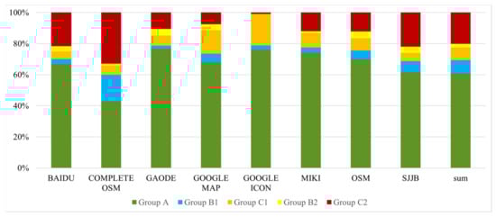 The statistical results indicated that map symbols in group A account for 60.6% of the total (see Figure 8). It means that 60.6% of map symbols perfectly fit the structures of Chinese characters. In total, 8.7% of map symbols (i.e., group B1) can be expressed by Chinese character structures, but more operators, such as union and blend, were needed to construct complex components. There are also some map symbols that require metric or color modifications, which cannot be performed by additional operators. There are some examples illustrated in Table 3.