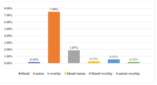 The usage of each operator is illustrated in Figure 9. It was found that the usage rate of the union operator is the highest, followed by the overlay operator. It is worth noting that we found that the construction of a map symbol may require more than one operator. For example, the union operator is used to build complex components, the structural operator combines components into a composite symbol according to a certain spatial structure, and the frame operator adds a frame, etc. The experimental results suggested that the additional operators can improve the formal representation of map symbols, but quite a few map symbols require modifications.