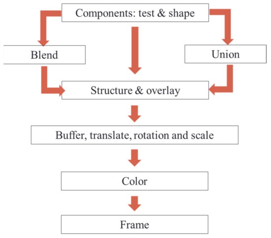 In summary, the primitives, including text primitives and graphics primitives, are generated according to the semantics first. Then, some primitives will be blended or union into complex components. The next step is structure operation or overlay operation. Once the structure is determined, the location of each unit in the structure is determined. Frame operator adds frames of different shapes or colors to symbols. The metric modifications reposition the components or change their size or orientation. In addition, the color modifications adjust the colors of components and frames. The process of symbol construction is demonstrated in Figure 21.