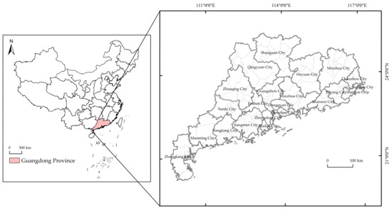 Guangdong Province is located in the southeastern coastal region of mainland China, with 21 prefecture-level cities under its jurisdiction, mainly comprising the four regions of Eastern Guangdong, Western Guangdong, Northern Guangdong, and the Pearl River Delta (Figure 1), covering a total area of about 180,000 square kilometers and a population of more than 113 million. As one of the most populous and economically developed provinces in China, Guangdong Province brings together 8% of the country’s population in less than 2% of the country’s land area, with a well-developed socio-economy, and a Gross Regional Product (GRP) of approximately RMB 129,118,858,000,000 in 2022, which has ranked first in the country for the 31st consecutive year, and with manufacturing, trade, and services being the main drivers of the socio-economy in Guangdong Province. However, due to the problems brought about by its rapid economic development, the province’s atmospheric environmental pollution problem has also become more and more serious. With the “Outline of the Fourteenth Five-Year Plan and Vision 2035 for the National Economic and Social Development of Guangdong Province”, “Fourteenth Five-Year Plan for the Ecological Civilization Construction of Guangdong Province”, and “Fourteenth Five-Year Plan for the Ecological Environmental Protection of Guangdong Province”, etc., the management of PM2.5 in Guangdong Province has entered into a new stage, and there are new objectives for the management of PM2.5 in the new era and situation. In 2025, the average annual concentration of PM2.5 in Guangdong Province will reach the target concentration of the 14th Five-Year Plan, and as the largest province in China in terms of economic output (GDP), with a complex and diverse industrial structure and a large population, Guangdong Province is facing the double pressure of economic development and environmental governance. In this context, exploring a path for PM2.5 pollution management that minimizes the impact of urban socio-economic development has a profound significance for the governments of Guangdong Province at all levels in formulating and implementing the relevant management programs.