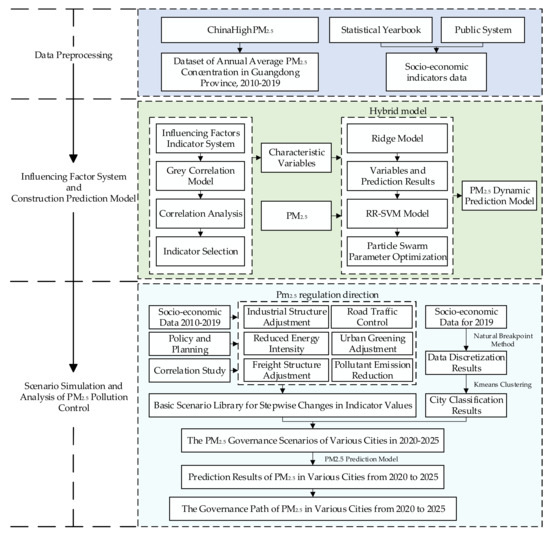 This study used Guangdong Province as the study area; we combined air pollution control policies such as the Three-Year Action Plan for Winning the Battle for the Blue Sky with socio-economic indicators such as the influencing factors of PM2.5 pollution, and analyzes the rationality of the indicators. Based on the historical data of PM2.5 and influencing factors in each prefecture-level city, a hybrid model coupling Ridge and SVM was constructed to realize PM2.5 concentration predictions. Based on the current development status of each prefecture-level city, a scenario construction method that takes into account the characteristics of urban development was proposed, and the PM2.5 management scenarios for each prefecture-level city in the 14th Five-Year Plan period were constructed using this method. Finally, based on the PM2.5 prediction model, the PM2.5 management scenario was simulated and predicted, and based on the results, the path of PM2.5 pollution management in Guangdong Province during the 14th Five-Year Plan period was determined. The evolution of the spatial and temporal patterns of PM2.5 pollution management processed and coupling coordination relationships were analyze by using the coupling coordination degree model to reveal the influence relationship among socio-economic development, air pollution management, and regional coordinated development. This research aimed to explore the interactions between economic and social development, environmental protection, and coordinated management through the prediction of PM2.5 concentrations, simulation of management scenarios, and a comprehensive study of the coupling and coordination relationships, so as to provide scientifically sound policy recommendations for the PM2.5 management targets of the 14th Five-Year Plan for Guangdong Province.