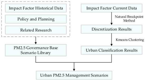 Due to certain differences between the socio-economic characteristics of different prefecture-level cities, using the traditional method to construct the same scenario simulations for all prefecture-level cities will cause the loss of the socio-economic development characteristics of the city. To solve this problem, this study utilized the similarities and differences between the socio-economic characteristics of different prefecture-level cities to classify the cities, and based on the characteristics of each type of city, we constructed a PM2.5 governance scenario intending to achieve the PM2.5 governance standard in 2025. The flowchart of the method is shown in Figure 3.