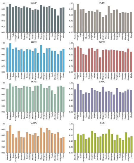 where is the standardized value of the indicator ; is the original value; and are the maximum and minimum values of indicator , respectively. In this way, GAPC was found to be a positive indicator, while STIR, ECPG, WHFR, GROC, and ISDE were found to be negative indicators.