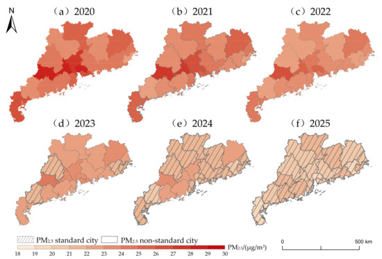 The predicted annual average concentration of PM2.5 in Guangdong Province from 2020 to 2025.