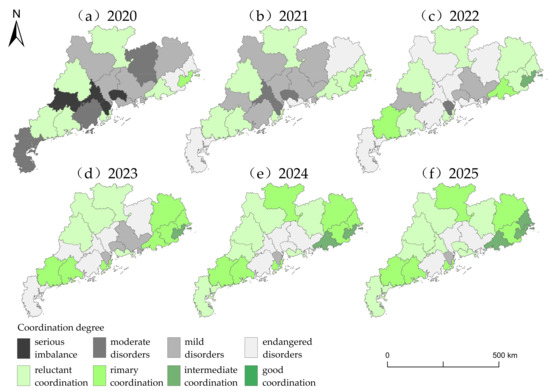 Figure 6 demonstrates the changes in the coupled coordination relationship of PM2.5 pollution management for each prefecture-level city in Guangdong Province in 2020–2025 under the PM2.5 pollution management compliance pathway. Combining Figure 4 and Figure 5, it can be seen that under the scenario simulation of the attainment pathway, with the reduction of PM2.5 concentration, the overall level of coupled coordination of factors influencing the management of PM2.5 pollution in Guangdong Province in 2020–2025 shows an increasing trend. From 2000 to 2022, due to higher PM2.5 concentrations, coupling coordination was dominated by moderate dissonance, mild dissonance, and near dissonance, with a lesser degree of reluctant coordination. After 2023, the environmental quality will be improved, the level of coordination will gradually rise, and some of the areas on the verge of dysfunction will be upgraded to barely coordinated and primary coordinated, which indicates that with the management of PM2.5 pollution and the concentration of the standard, the regional coordination relationship will be gradually optimized, and the number of intermediate coordinated cities will increase, while the level of some barely coordinated cities will be upgraded to primarily coordinated.