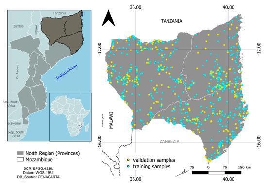 Location of the study area in the Mozambique, showing training samples (cyan) and validation samples (yellow) collected in 2020. Source: database from the National Cartography and Remote Sensing Centre (CENACARTA).