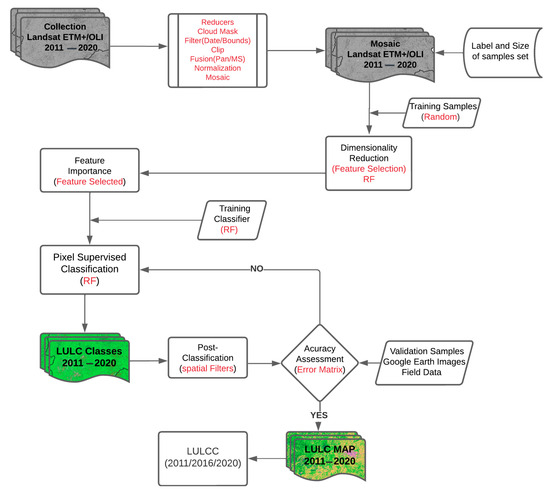 LULC was mapped from the top-of-the-atmosphere (TOA) reflectance data retrieved from the time series of the Landsat 7, Enhanced Thematic Mapper Plus (ETM+) (LANDSAT/LE07/C01/T1_RT_TOA) and Landsat 8, and Operational Land Imager (OLI) (LANDSAT/LC08/C01/T1_RT_TOA) images from 2011 to 2020, available in the GEE platform. This period was defined based on the high levels of deforestation alerts that were broadcast by press, civil society, and the scientific community.
