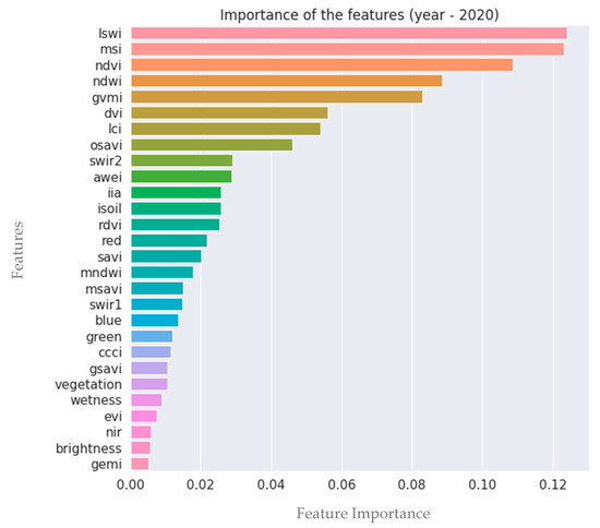 The number of variables considered relevant and suitable remained reasonably consistent after several tests. The 10 most important variables were selected for each year, but only one year is shown for illustration purposes. In these 10 years, the following common variables were selected: NDVI, LSWI, MSI, NDWI, GVMI, and DVI, which were ranked differently in the order of importance. These spectral indices, particularly the NDVI and NDWI, are consistently identified in several LULC mapping initiatives [40,47,71]. Although water bodies were not mapped in this study, the NDWI was shown to be relevant, meaning that it has potential to be considered in future mappings of this region [72,73].