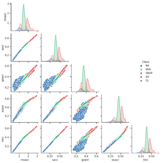 Scatterplots showing the relationship between the variables and the spatial separability of the classes mapped for 2020. BA = built-up areas; NVA = non-vegetated areas; OEDF = open evergreen and deciduous forest; DV = dense vegetation; and CL = croplands.