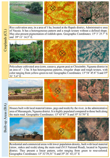Main characteristics of the agricultural areas and built-up/urban areas in the northern region of Mozambique observed in Landsat and high-resolution images. The symbol present in the images in the middle column and on the right indicate the exact location of the area shown in the photo on the left.