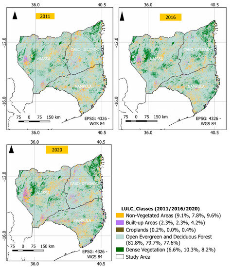 Land-use and land-cover maps of the northern region of Mozambique, years 2011, 2016 and 2020. Proportion of each class for each year is shown in the legend.