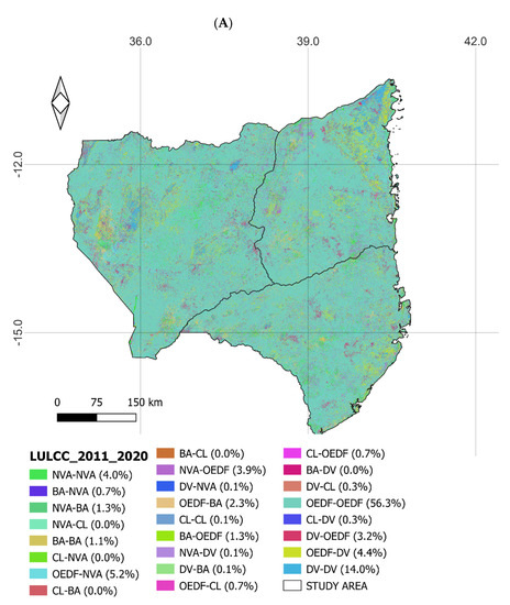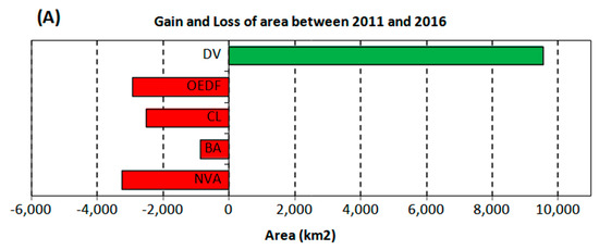 The graphics in Figure 8 show the proportions of surface area of transitions between classes for years 2011 to 2016, 2016 to 2020, and 2011 to 2020. In general, LULC change detection between 2011 and 2020 revealed that non-vegetated areas had increased by 0.7%, built-up by 2.0%, and dense vegetation by 1.3%. On the other hand, open evergreen and deciduous forests had decreased by 4.1% and croplands by 0.01%. The dynamics between 2011, 2016, and 2020 highlight a 3.3% higher gain than loss between 2011 and 2016—a scenario that was opposite to that between 2016 and 2020, in which the loss was approximately 2.4% higher than the gain. Of the total 50,410 km2 of dense vegetation in 2011, approximately 8,261 km2 became open vegetation in 2016. In 2016, approximately 14,580 km2 of dense vegetation became open vegetation, in contrast to an open vegetation gain of 8,945 km2. However, the analysis of the dynamics between 2011 and 2020 showed a higher gain than loss (4.7% versus 3.7%), which revealed a vegetation stability scenario, as shown in Figure 9.