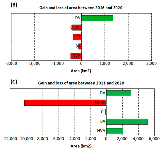 Graphics showing land-use and land-cover transitions between 2011 and 2016 (A), 2016 and 2020 (B), and 2011 to 2020 (C). DV = dense vegetation; OEDF = open evergreen and deciduous forest; CL = croplands; BA = built-up areas; and NVA = non-vegetated areas.