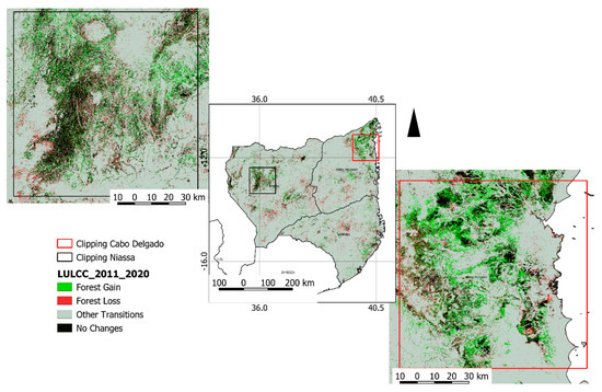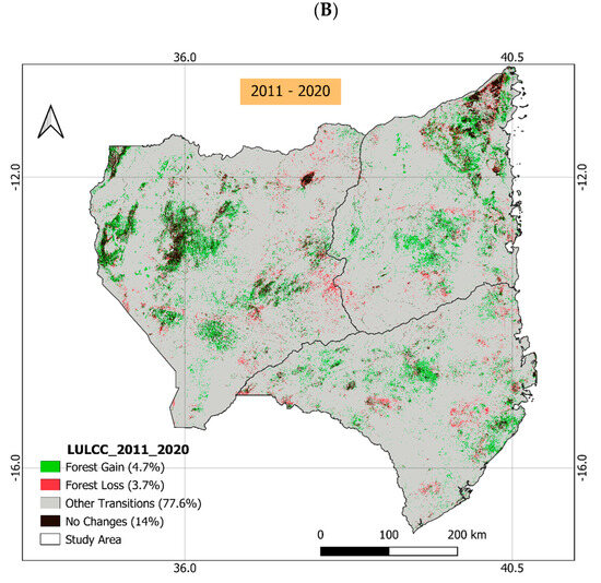 The forest and savanna areas were cyclically transformed in an alternating sequence, that is, on the one hand, the forest became savanna and, on the other hand, the savanna became forest. Figure 10 shows the temporal and spatial LULC dynamics of the period 2011–2020 in the highly forested provinces of Niassa and Cabo Delgado, respectively, and the spatial transitions of the forest in these provinces.