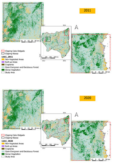 As reported before, the following LULC classes were mapped in this study: non-vegetated areas, built-up areas, croplands, open vegetation (savanna), and dense vegetation (forest) (Figure 7). According to these maps, a large extension of non-vegetated areas was confused with built-up area, mainly in the Niassa province, which is the province with the lowest population density in the region and has a limited urban structure. Phan et al. [47] stated that this low accuracy may be associated with the dataset selection performed in this study, which is a crucial step in the classification using GEE in areas with similar dynamics.