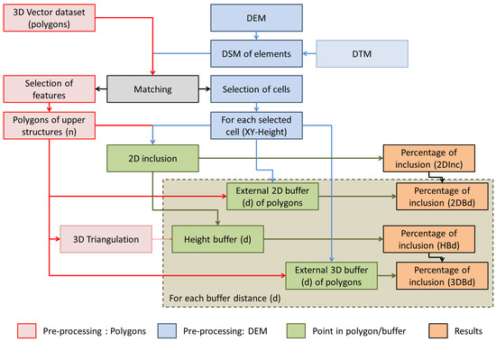 Once all the data were prepared for the assessment procedure, the rest of the proposed methodology was applied using a software developed in Java JDK 1.8 for this purpose. This includes obtaining the triangulation and the results of the assessment. In this sense, the application allowed us to obtain percentages of the inclusion of cells inside matched polygons and different buffers generated around them (results of percentage of 2DInc, 2DBd, HBd and 3DBd). The buffer distances (d) selected were 0.5 m, and 1 to 10 m with a step of 1 m. This meant 11 values of buffer distance applied to the three cases (2D buffer, height buffer and 3D buffer).