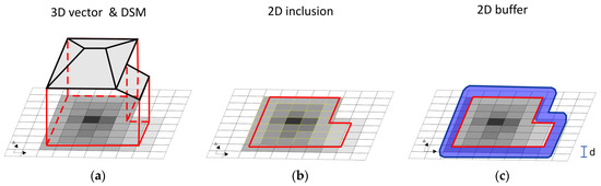 The assessment considers that each cell of the DEM dataset represents a position in space defined by its XY coordinates and the height data (included as an attribute). Following the uncertainty model described previously, we assume that each element presents an uncertainty band surrounding its more probable position. This band can be simplified by using a buffer which surrounds the element. In this sense, we adapt the procedure described by Goodchild and Hunter [30] for linear features and expanded to 3D by Mozas-Calvache and Ariza-Lopez [33]. They considered several buffer distances to estimate the percentage of the total length of the low-accurate lines that lie within a specific distance of the reference. As a result, a distribution function of the percentages of inclusion inside buffers is obtained. In our approach, we consider three buffers of a certain distance to the vector element (d), a 2D buffer around the vector element to determine the planimetric accuracy, a height buffer above and below the element to determine the vertical accuracy and a 3D buffer around the 3D vector element to determine a complete value of 3D accuracy. Therefore, the 3D vector element is considered as a surface where several buffers are applied. The determination of the percentage of inclusion of cells (of each element) within each buffer (considering several distances d) is obtained by considering the spatial behavior of their positions (XY coordinates of the center of the cell and height attribute) and the polygon that defines the vector element. The method follows this procedure: