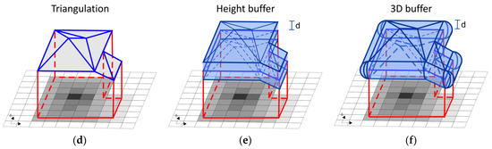 Determination of buffers: (a) 3D vector (polygons) and DSM; (b) 2D inclusion; (c) 2D buffer; (d) 3D triangulation of polygon (check-surface); (e) height buffer; (f) 3D buffer.