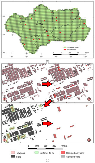 After taking into account the spatial extent of the data (Andalucía covers more than 87,000 square kilometers) and the distribution in cartographic sheets (zones) of the products used in this study, we selected 34 sheets of about 7.3 per 4.7 km (area of 34.3 square kilometers) (Figure 3a) containing data related to buildings. Therefore, we considered a large area of more than 1100 square kilometers. The selection of zones (sheets) considered several aspects in order to provide a complete study. Thus, the selected zones were well distributed in the territory (eight provinces), including rural and urban areas and a great diversity of heights and slopes (Figure 3a).