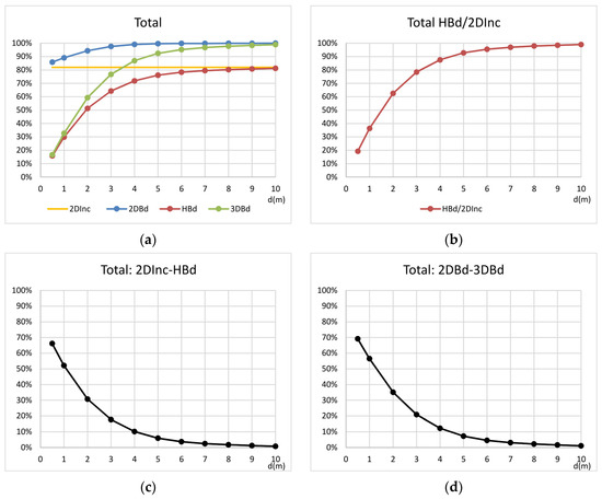 Figure 4 also shows a relative comparison of the previous results. Thus, Figure 4c shows the difference of percentages of inclusion between 2DInc and HBd. In this case, the graphic shows a decrease in the difference between both results, achieving 5% of difference at 5.5 m. Figure 4d shows the difference of percentages of inclusion between 2DBd and 3DBd. In this case the graph is quite similar to the previous one, achieving 5% of difference at 6 m. Both graphs represent the difference between 2D and 3D cases, considering (2DBd-3DBd) and not considering (2DInc-HBd) the planimetric uncertainty of data.